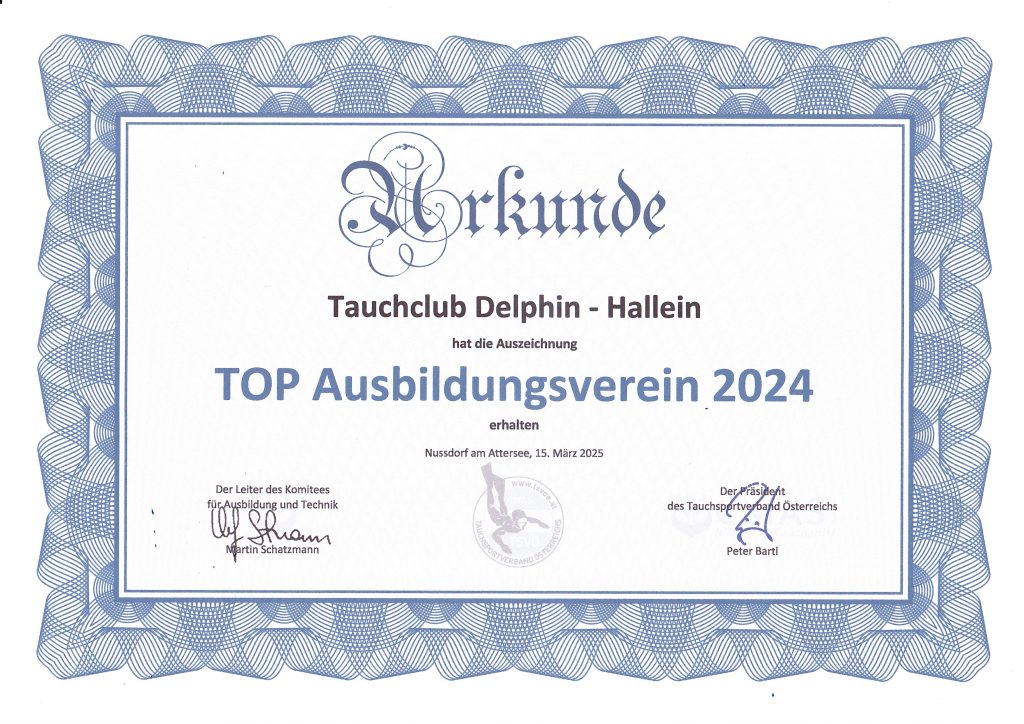 Wir, der Tauchclub Delphin Hallein, sind stolz, vom Tauchsportverband Österreichs (TSVÖ) als TOP Ausbildungsverein 2024 ausgezeichnet worden zu sein! Die feierliche Kürung fand am 15. März 2025 in Nußdorf am Attersee statt.